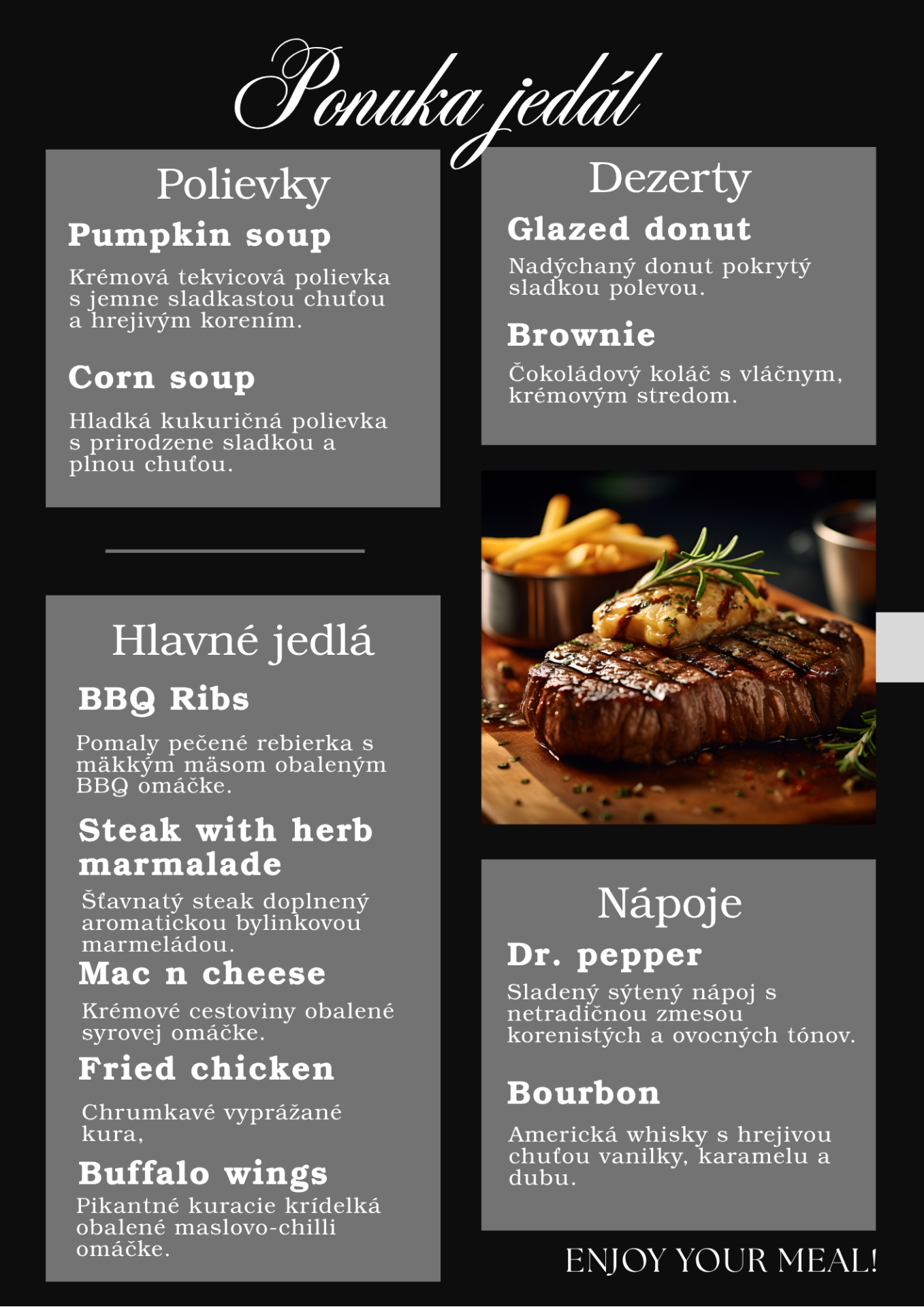 V našej ponuke jedál pre Americký týždeň, vám ponúkneme túto pestrú zmes ako napríklad BBQ rebierka, krémové cestoviny Mac n Cheese a oslaďte si chuťové poháriky vláčnym brownie koláčikom.