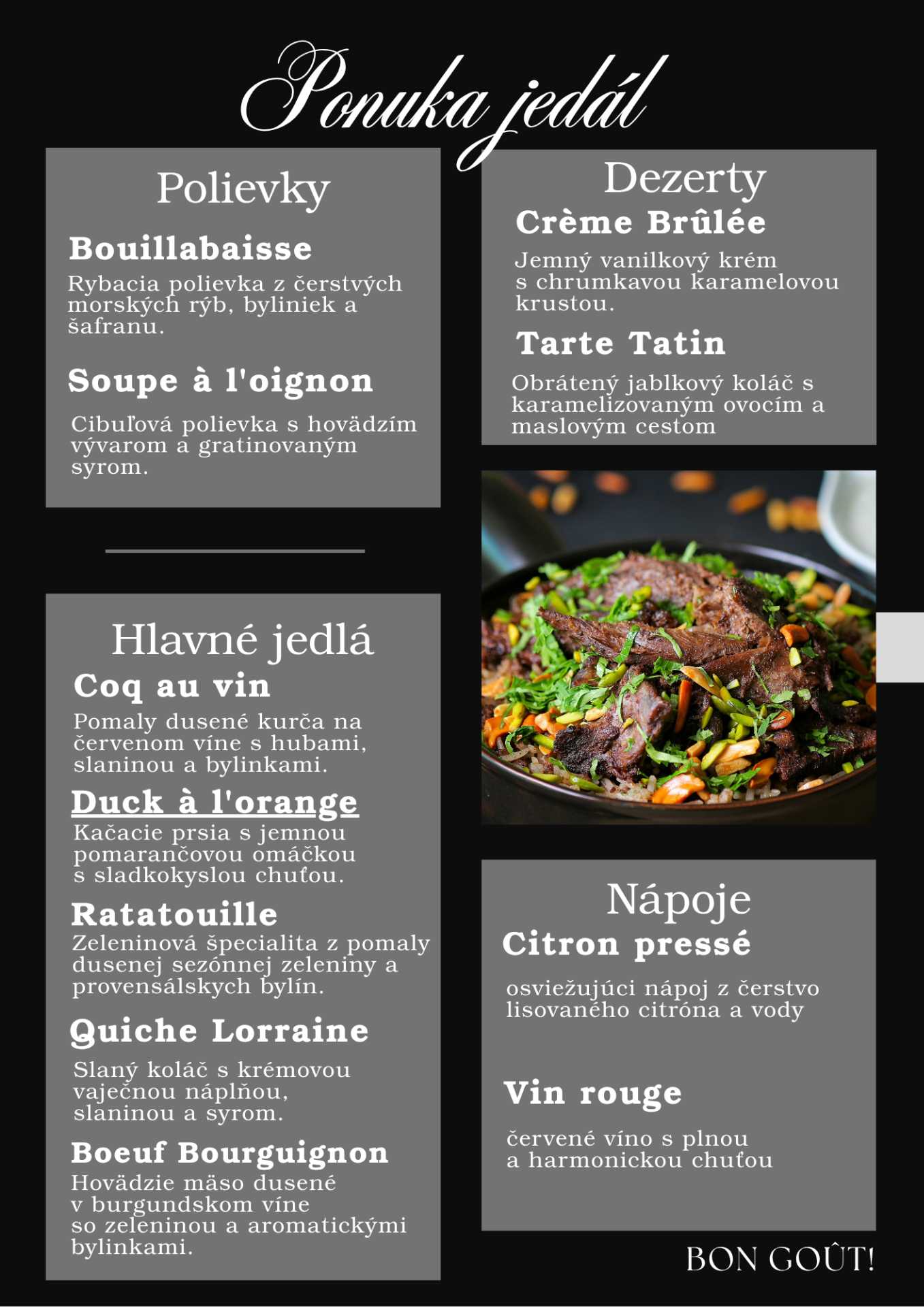 V našej reštaurácii budete mať možnosť ochutnať ikonické jedlo zo zeleniny Ratatouille, Coq au vin čo je dusené kurča na kvalitnom červenom víne a ako polievky ich ikonickú cibuľovú polievku "Soupe á l'oignon".